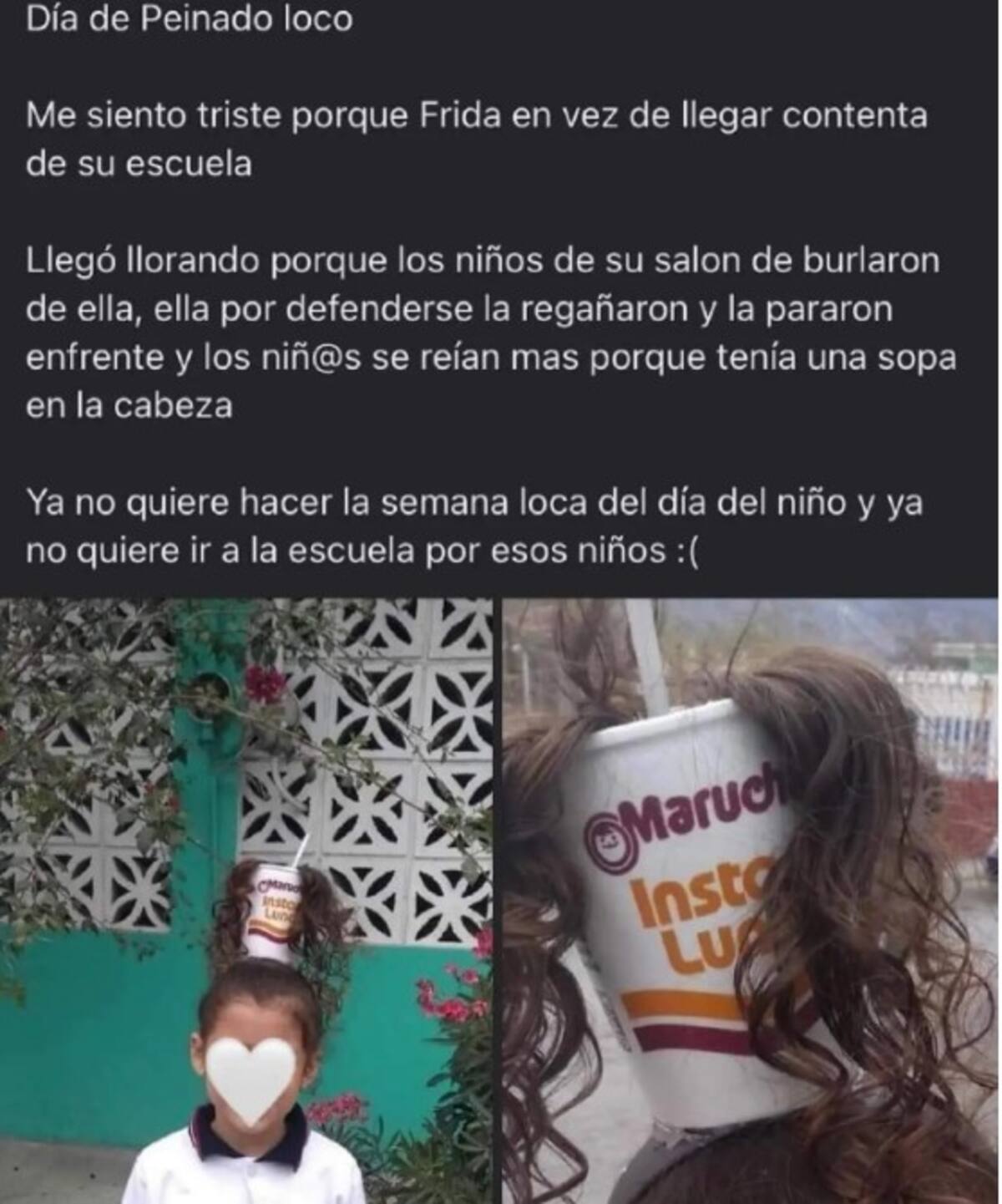 A través de la cuenta de Facebook de la madre de la menor, se compartió que la niña de nombre Frida acudió a su escuela para celebrar el Día del Peinado Loco, con motivo del Día del Niño, pero su hija no la pasó nada bien pues recibió burlas.