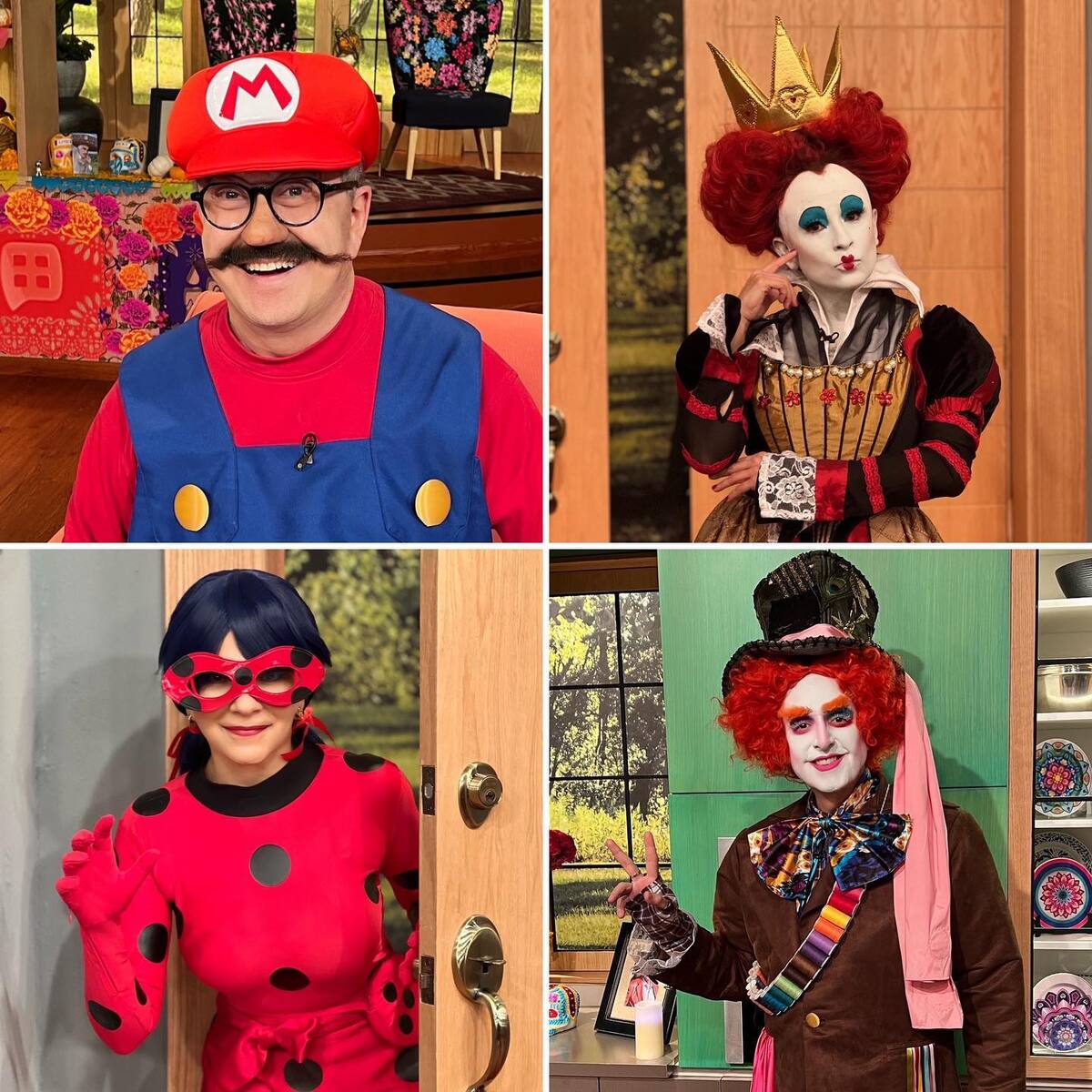Daniel Bisogno se disfrazó del "Sombrerero loco"; Pedro Sola de Mario Bros; Linet Puente de Reina de Corazones; y Pati Chapoy de Ladybug, quienes sorprendieron a los televidentes al aparecer vestidos con algunos de los famosos disfraces para celebrar Halloween.