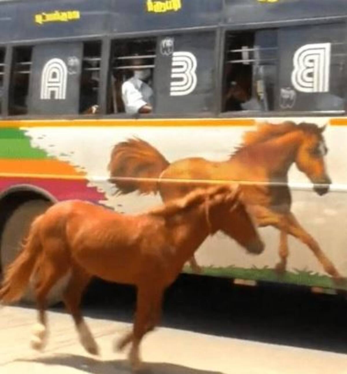 En el caso de un potro visto en Coimbatore, una ciudad situada al sur de la India, el pequeño animal vio una imagen en un autobús de un caballo idéntico a él, galopando, por lo que pensaría que su madre había regresado.