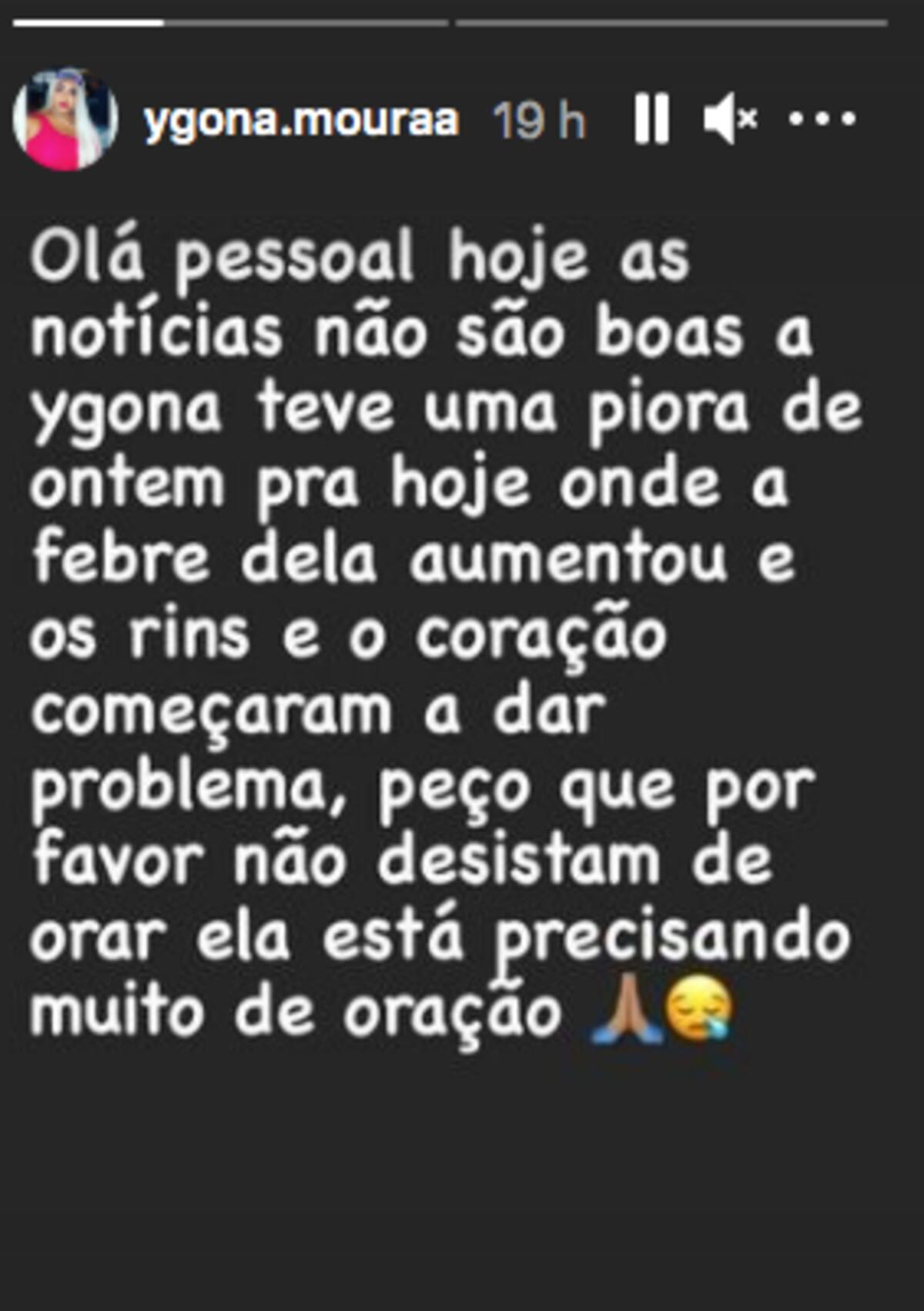 “Hola chicos hoy las noticias no son buenas. Ygona empeoró desde ayer hasta hoy donde su fiebre aumentó y sus riñones y corazón comenzaron a dar problemas, les pido que por favor no dejen de orar porque necesita mucha oración.”, comunicaron por medio de una historia de Instagram.