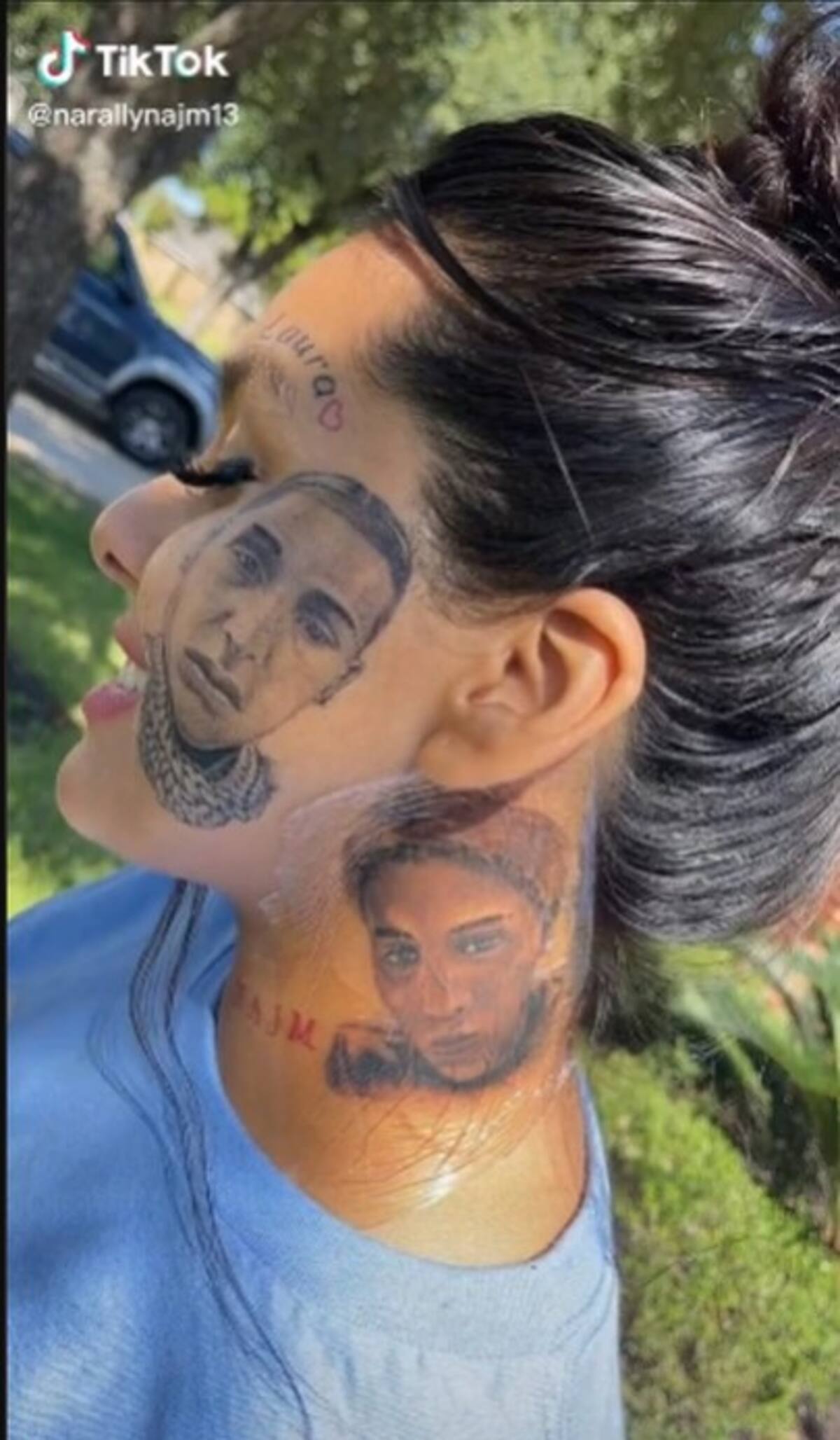 Laura Najm (@narallynajm13) compartió en su cuenta de TikTok que se tatuó la cara en honor a su pareja que le puso los cuernos para que regresara con ella de una vez por todas.