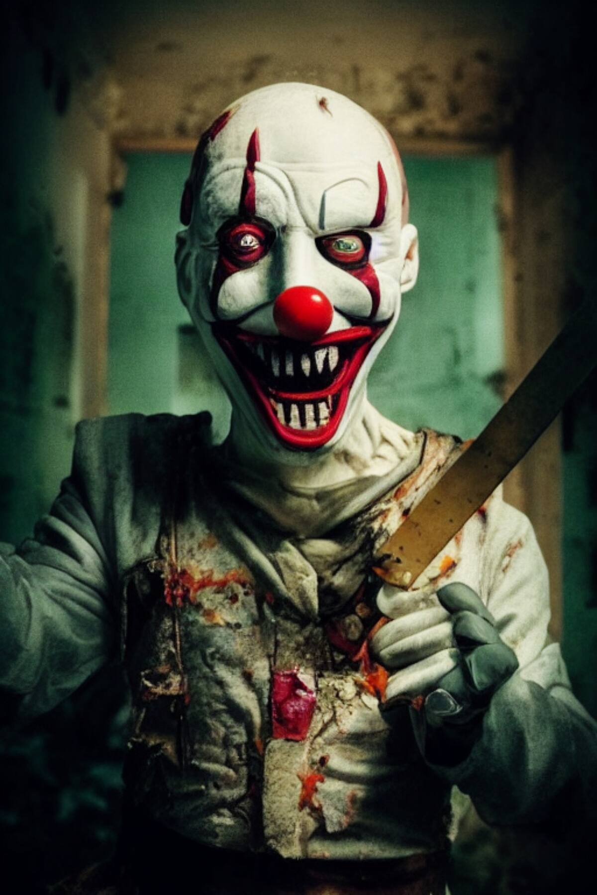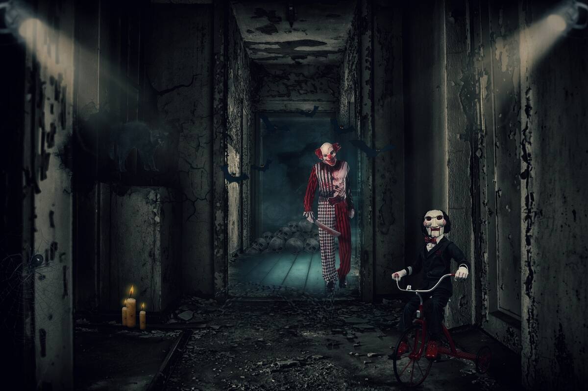 La pareja de amigos, ya muy nerviosos, se disponen a regresar por donde entraron pero del fondo aparece este macabro payaso con una sierra eléctrica y de la escalera aparece otro payaso terrorífico con un hacha, listo para atacarlos.