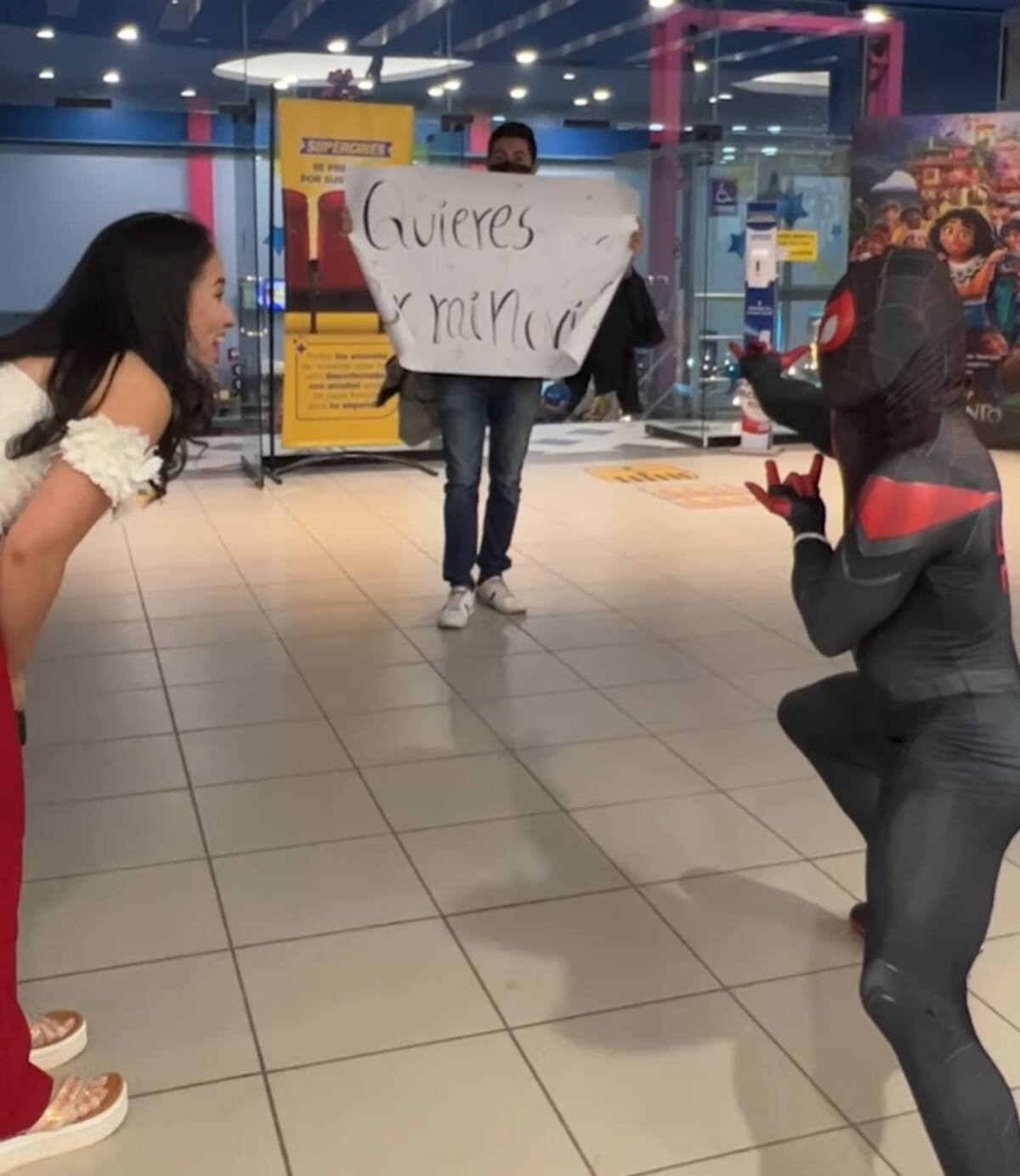 No obstante, cuando llegan con la joven, quien estaba acompañada por otras personas, el chico comienza a hacer ademanes de “Spider-Man”, llamando la atención de su enamorada.