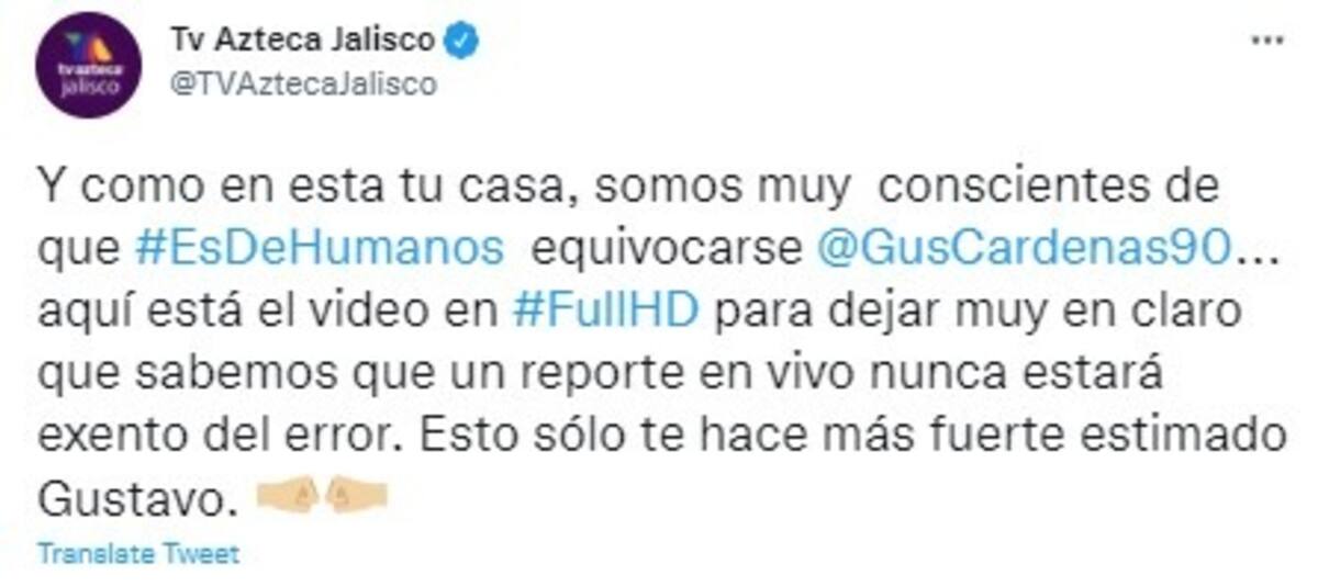 "Y como en esta tu casa, somos muy conscientes de que #EsDeHumanos equivocarse Gus Cárdenas… aquí está el video para dejar muy en claro que sabemos que un reporte en vivo nunca estará exento del error. Esto sólo te hace más fuerte estimado Gustavo", escribieron en un tuit.