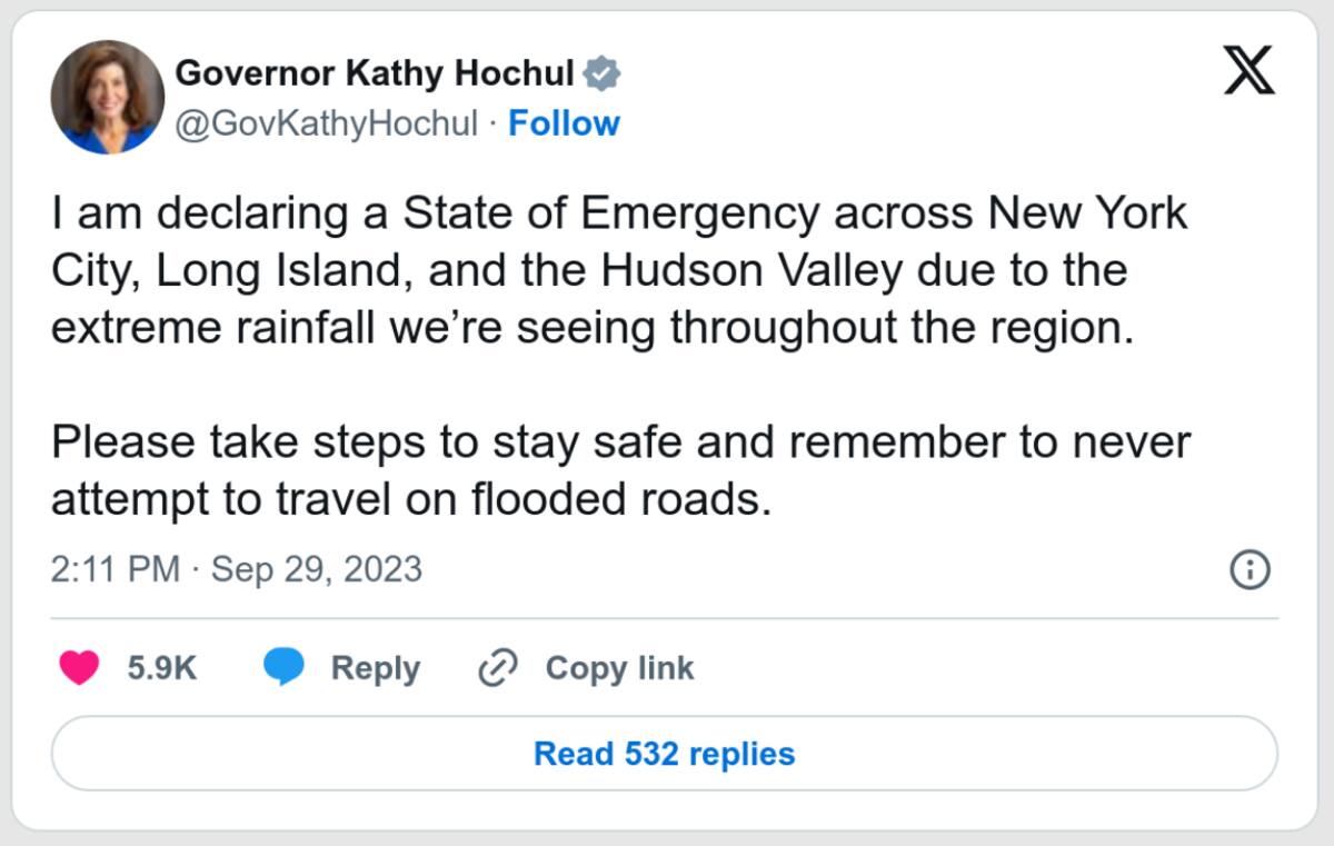 La gobernadora de Nueva York, Kathy Hochul, anunció oficialmente el estado de emergencia en la ciudad, reconociendo la gravedad de la situación. Las lluvias torrenciales han desencadenado inundaciones de proporciones significativas, obligando a cerrar carreteras en el área metropolitana y a suspender el servicio de las líneas de metro cruciales como Brooklyn, Staten Island, New Haven y Harlem.
