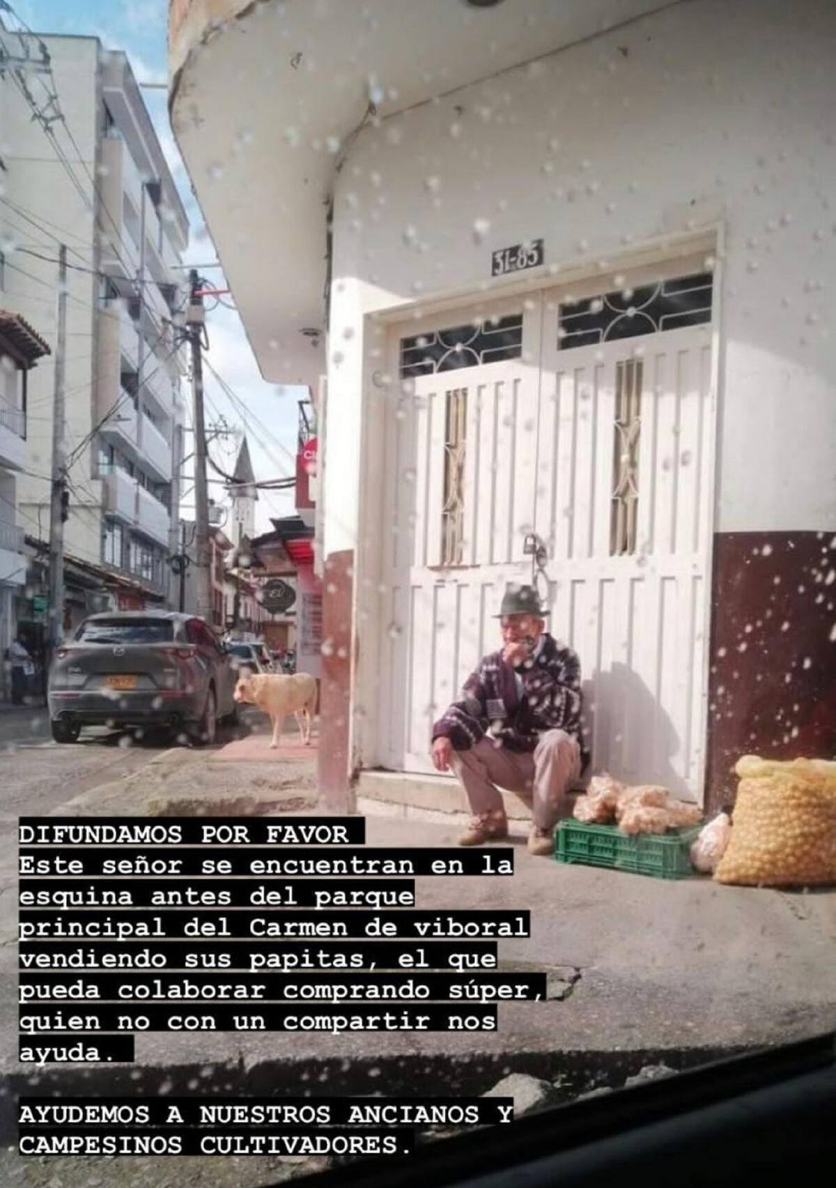 En Carmen de Viboral hay un adulto mayor, en la esquina antes de llegar al parque central del municipio, vendiendo sus papitas. Casi no ha vendido nada. Si conocen a alguien cerca que le pueda comprar por favor. Apoyémonos entre todos”, escribió el buen samaritano.