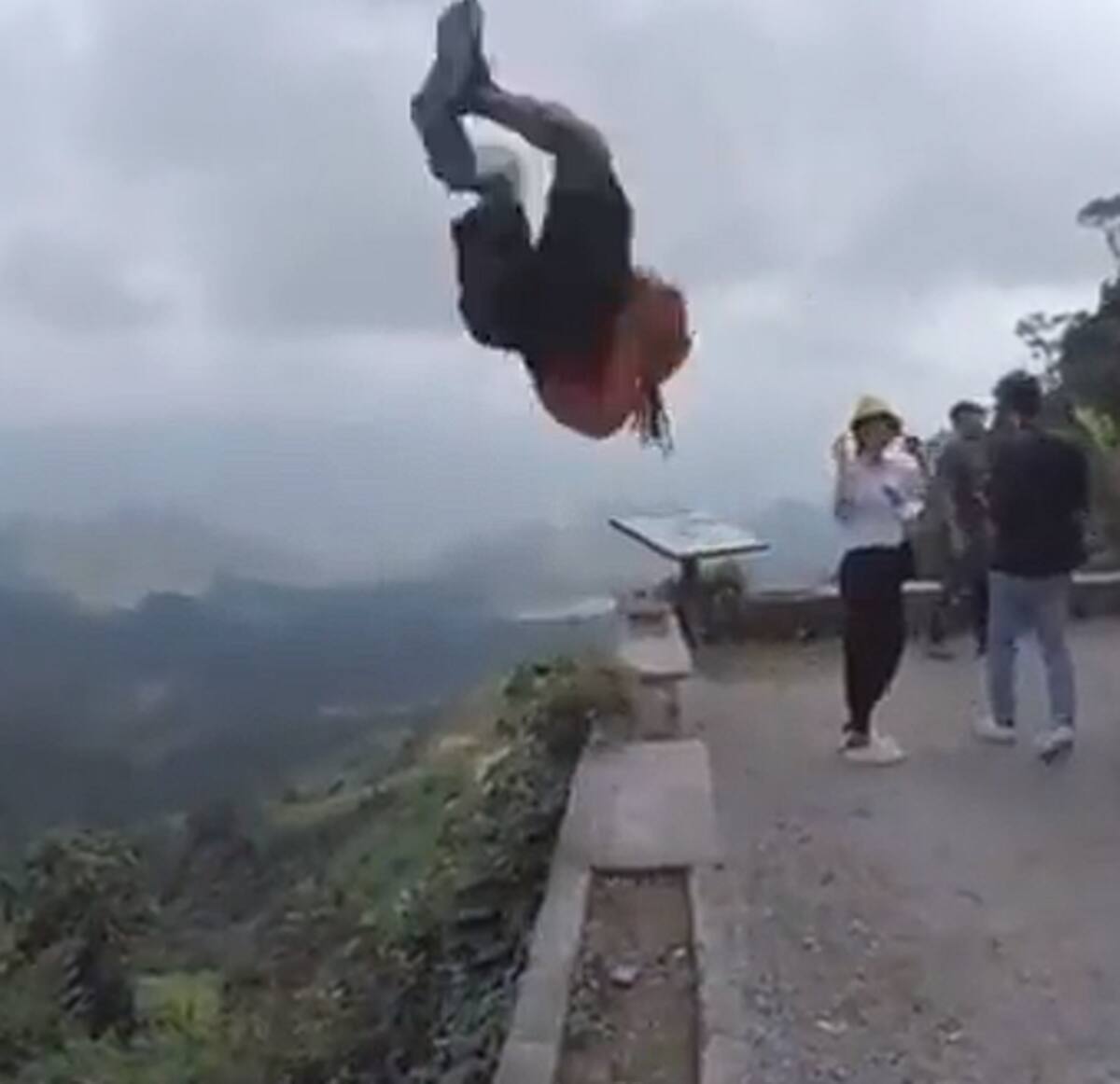 Por medio de un video documentaron al sujeto intentando hacer un brinco de amplia dificultad a la orilla de una montaña, pero al momento de finalizar el movimiento no logra mantener el equilibrio y cae cuesta abajo sin ninguna protección de seguridad.