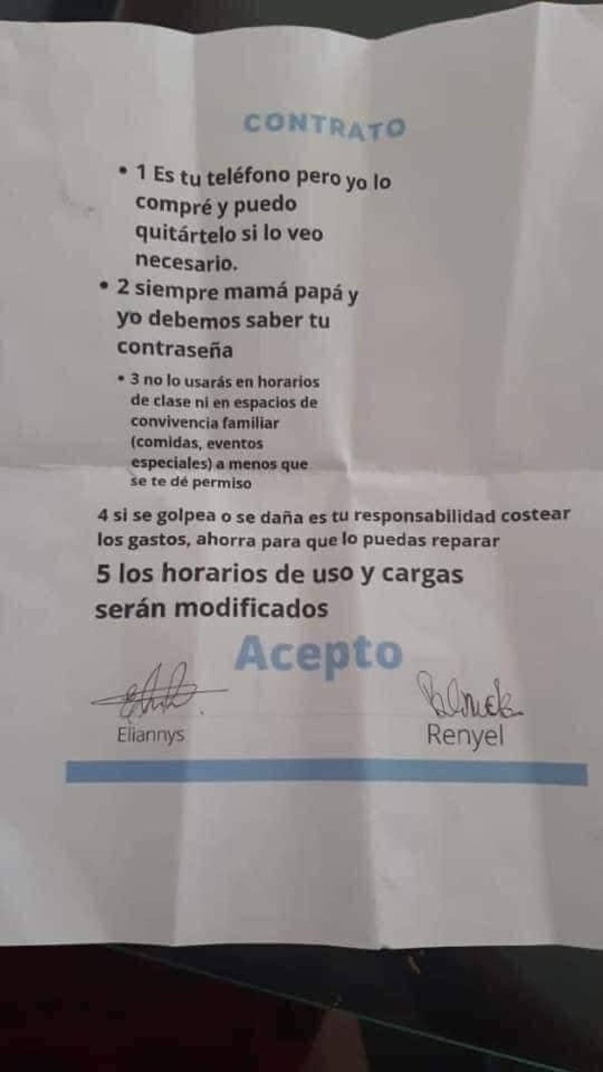 En las divertidas imágenes compartidas, el niño aparece firmando un contrato que establece las reglas y responsabilidades asociadas con la posesión de su nuevo dispositivo. Algunas de las cláusulas más notables incluyen: